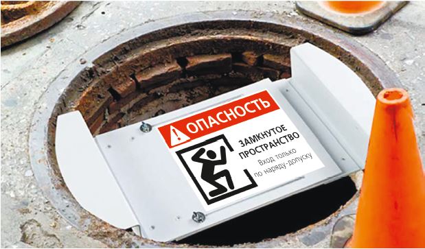 Надпись информирует об опасности, необходимости иметь разрешение на спуск в колодец и соблюдать правил работы в замкнутом пространстве.