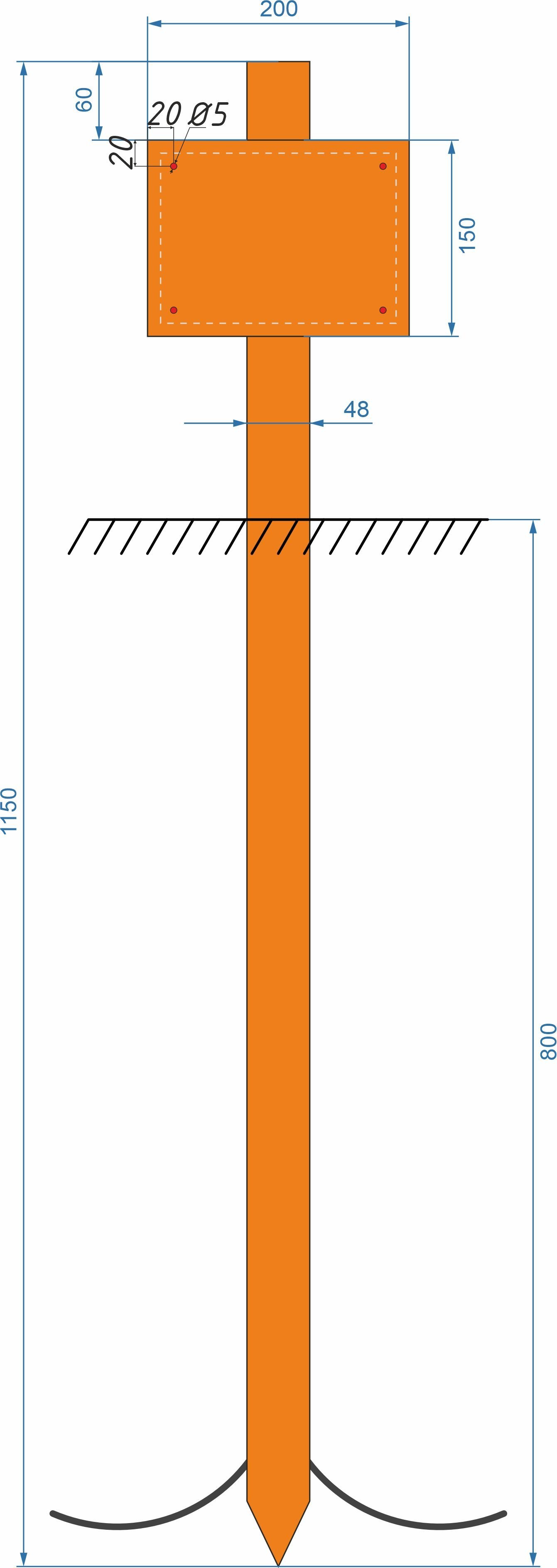 Конструкция межевой знак, 200x1800, труба оцинкованная D76х3,5 мм L=1150 мм, со сплющенным нижним основанием, якорем пруток D5 мм. Табличка 200х150 оцинкованный 0,8 ПО без печати.Код: ЦБ-00119463