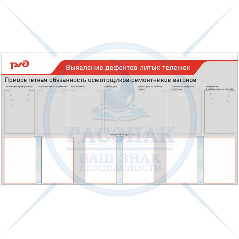 Стенд Информация РЖД, 5 карманов А4 пл., 2 кармана А4 объемн., перекидная система на 6 ячеек (1400х1200; Пластик ПВХ 4 мм, алюминиевый профиль; )