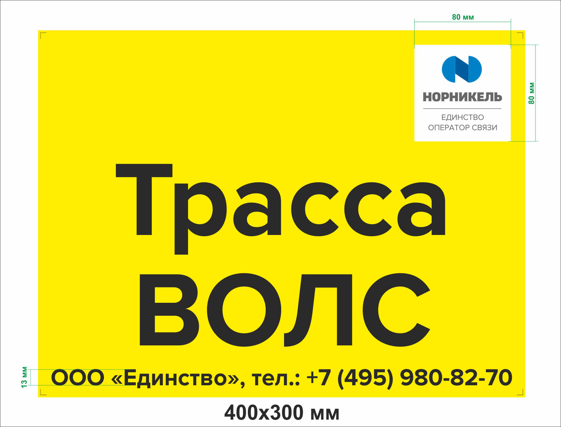 Табличка для столбов. Текст "Трасса ВОЛС". Цвет желтый. Размеры:Длина 400мм, Высота - 300мм.