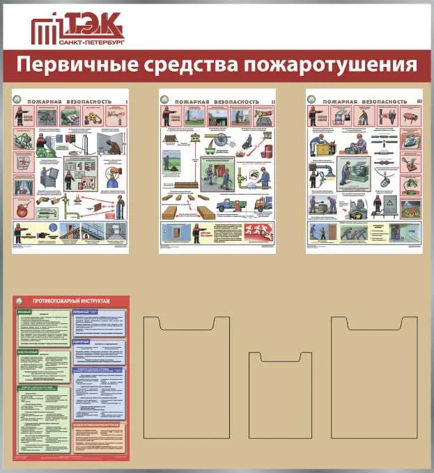 Стенд Пожарная безопасность, 6 горизонтальных плакатов А3, 5 карманов А4, Логотип (1500х1200; Пластик ПВХ 4 мм, алюминиевый профиль; Алюминиевый профиль)