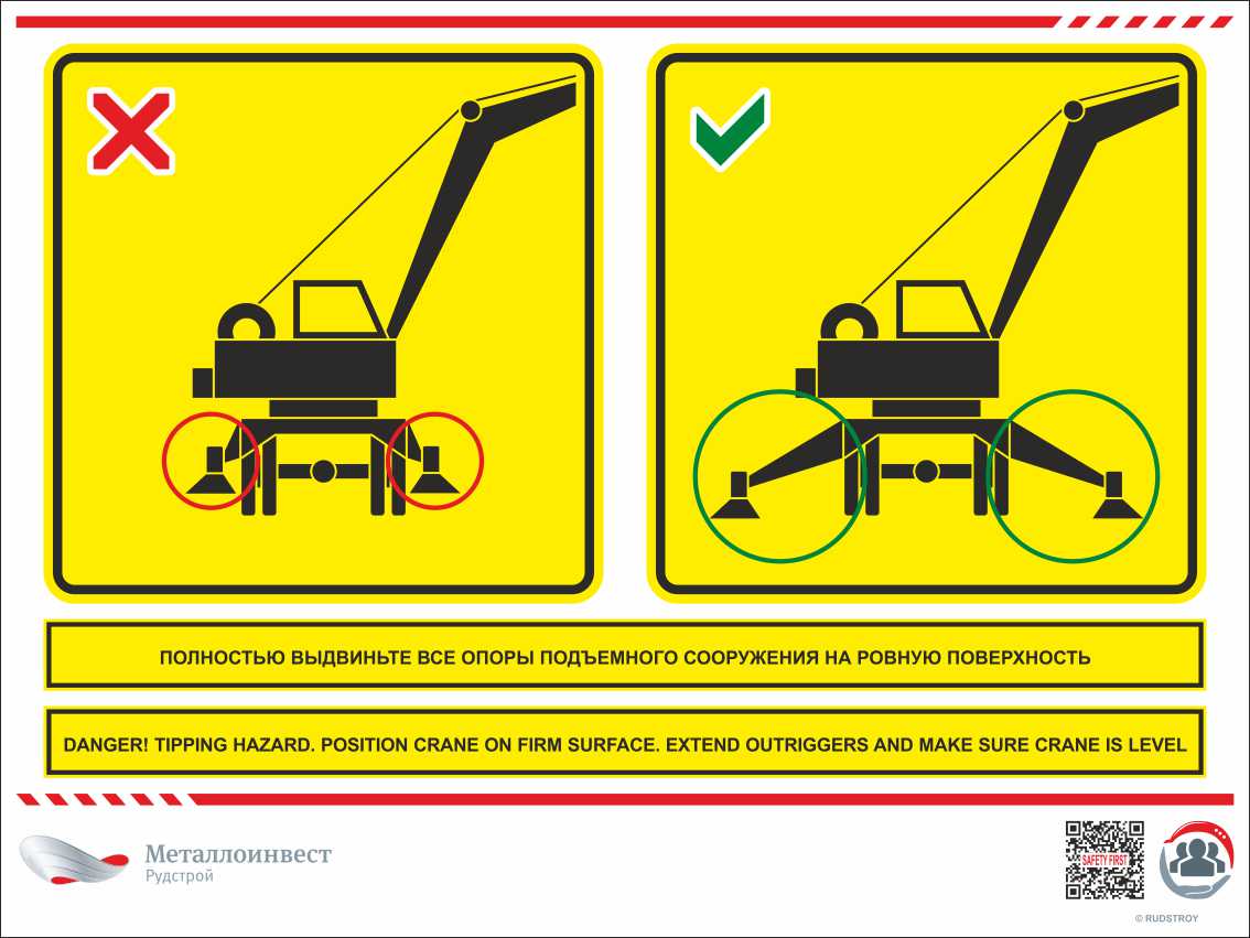Мультиязычный знак безопасности - Полностью выдвиньте все опоры подъемного сооружения на ровную поверхность