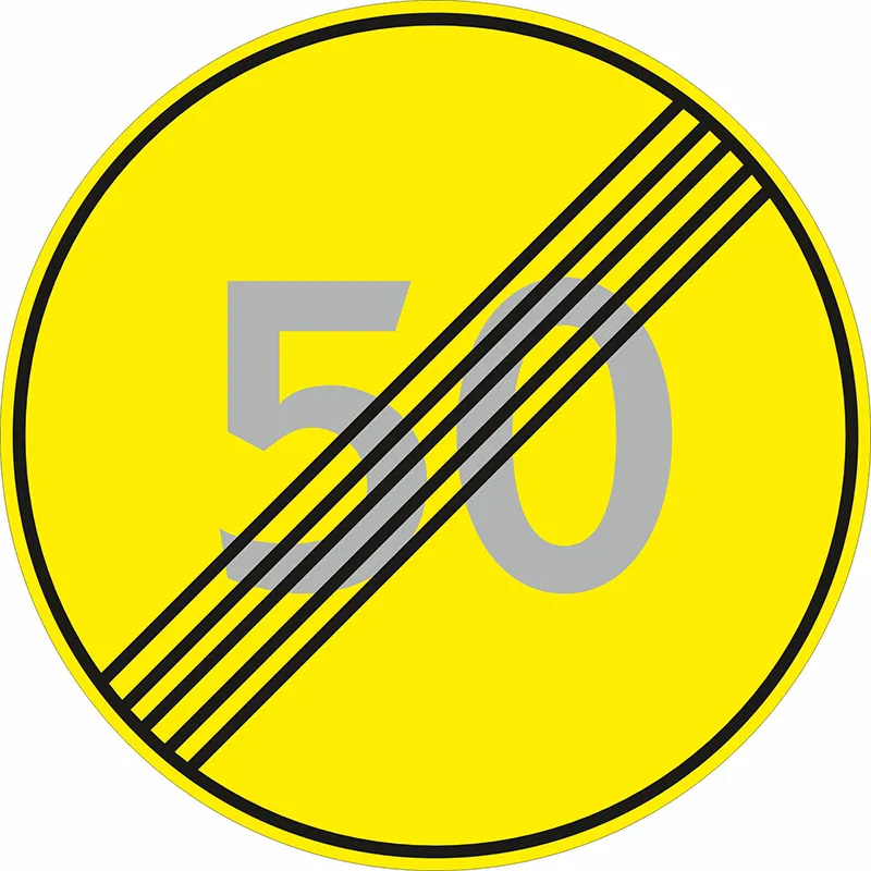 «Конец ограничения максимальной скорости» обозначает завершение участка, на котором был введен запрет на превышение определенной скорости — как правило, из-за проведения в этой области дорожных работ. Знак используют в случаях, когда нет необходимости распространять зону действия запрета до перекрестка или границы населенного пункта. На одно-, двух- или трехполосных дорогах размещают на обороте запрещающего знака, который он отменяет, — оповещение для водителей транспорта, передвигающегося по встречной полосе.